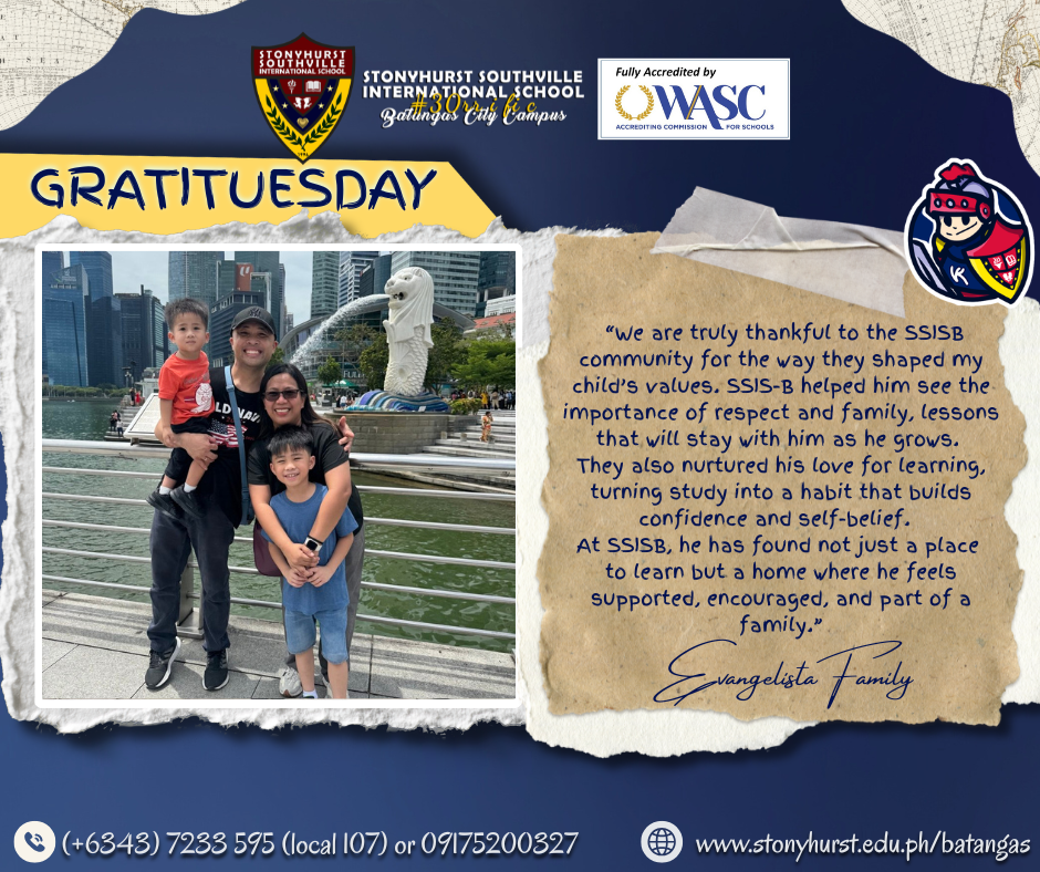 “We are truly thankful to the SSISB community for the way you’ve shaped my child’s values. You’ve helped him see the importance of respect and family, lessons that will stay with him as he grows. You’ve also nurtured his love for learning, turning study into a habit that builds confidence and self-belief. At SSISB, he has found not just a place to learn but a home where he feels supported, encouraged, and part of a family.” — Evangelista Family
