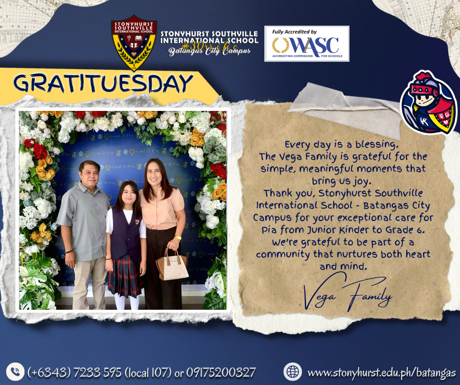 “Every day is a blessing. The Vega Family is grateful for the simple, meaningful moments that bring us joy. Thank you, Stonyhurst Southville International School – Batangas City Campus for your exceptional care for Pia from Junior Kinder to Grade 6. We’re grateful to be part of a community that nurtures both heart and mind.” —Vega Family